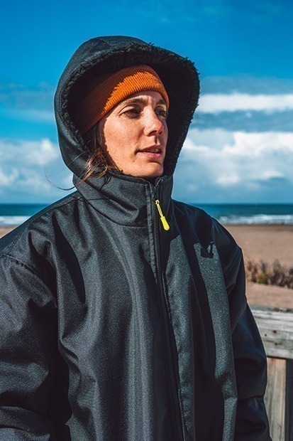Camperón impermeable con capucha, ideal para mantenerse abrigado antes y después del surfing, con dos tipos de interiores: corderito o microtoalla sublimada (color azul o fucsia), y doble cierre reforzado. Para utilizar en tu vehículo y volver a casa con el traje puesto, sin necesidad de tomar frio cambiánose a la interperie, y sin ensuciar o mojar los asientos. También funciona